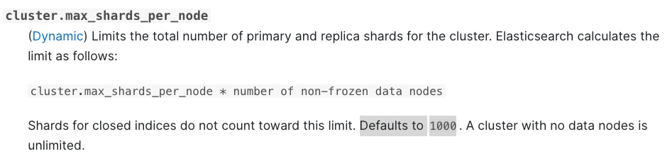 - cluster.max_shards_per_node 설정으로 클러스터 샤드 제한을 동적으로 조정할 수 있으며, 이는 노드당 최대 수를 제한합니다.