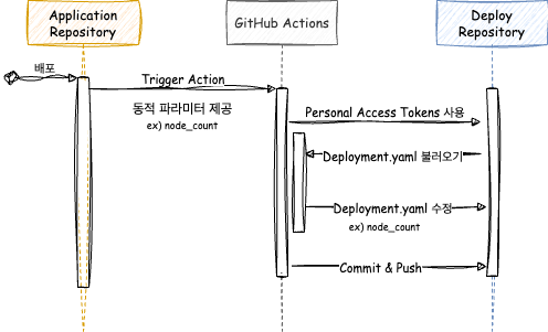 Argo CD가 GitOps 방식을 따르므로, 애플리케이션 배포 시 GitHub Actions를 활용하여 Deploy Repository의 yaml 파일을 워크플로우 디스패치 이벤트로부터 받은 파라미터로 동적으로 수정합니다. 이를 통해 최종 배포 단계에서 yaml 파일을 업데이트하여 파라미터를 주입합니다. (* yq 활용)