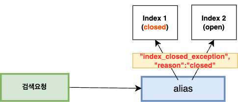 alias 연관 인덱스를 close 하고 alias 검색 시 close 인덱스에도 접근을 시도 하게 되어 index_closed_exception 예외가 발생하며 검색 요청이 실패합니다.